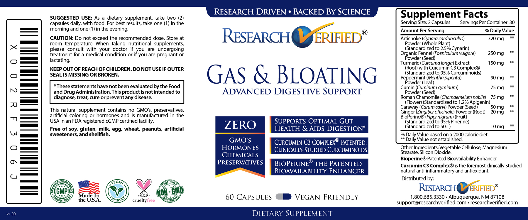 In summary, Research Verified® Gas & Bloating meets all of the criteria listed above. It's the highest quality gas and bloating supplement on the market. Here's a list of some of the criteria that it meets.